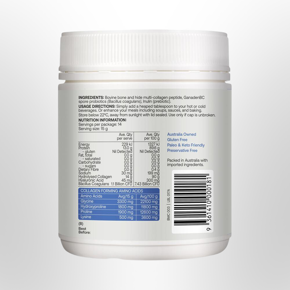 Featuring a blend of grass-fed bovine collagen (Types I, II, III), marine collagen (Type I), and chicken bone broth collagen (Type II), this powder delivers a full spectrum of collagen types to support various bodily functions. The addition of a shelf-stable probiotic enhances gut microbiome balance and digestive health. Easily dissolve this odourless and tasteless powder into your coffee, smoothies, water, or favourite recipes for a convenient and highly absorbable collagen and probiotic boost.
