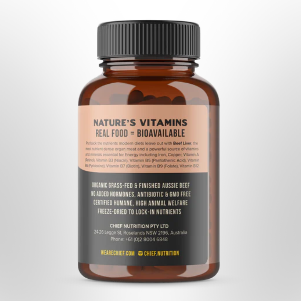 Ingredients (per capsule): 81% Organic Australian, Grass-fed and Grass Finished Beef Liver (500mg), 19% Bovine Gelatine Capsule (120mg).