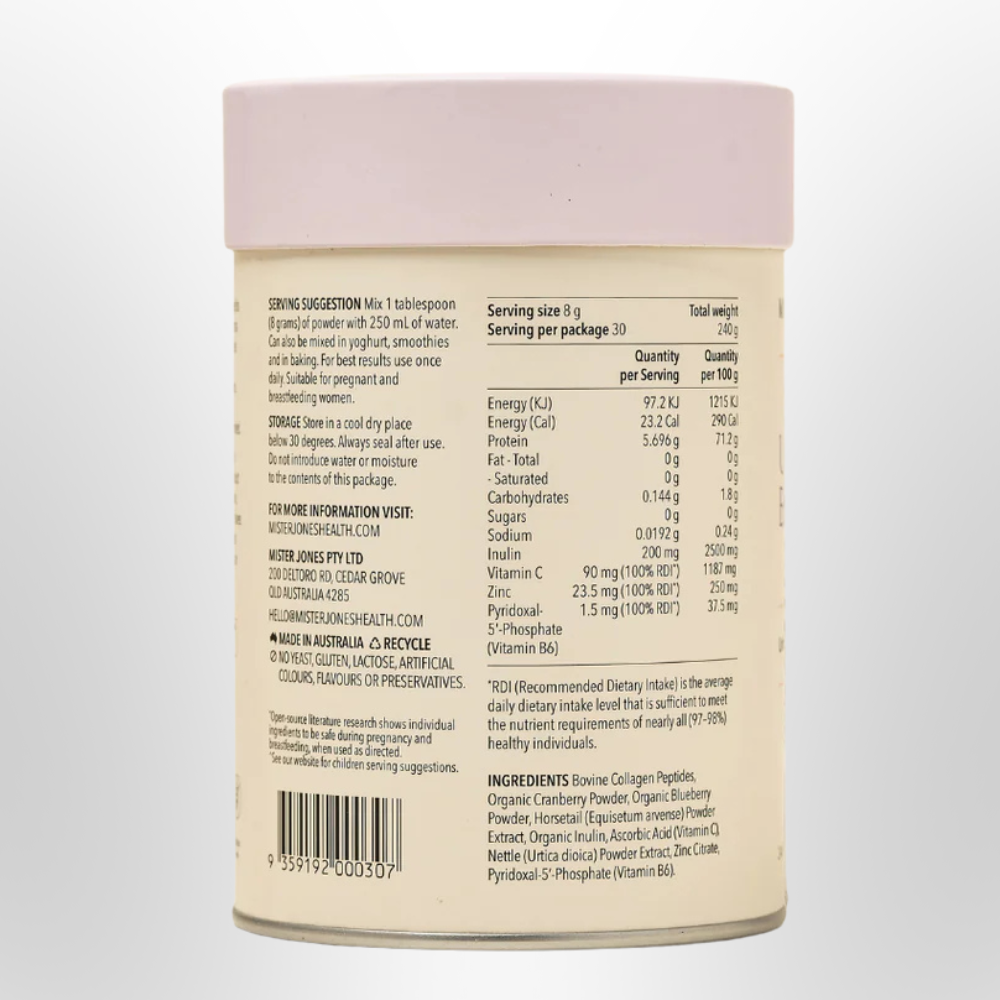 Bovine Collagen Peptides, Corn Fibre, Organic Cranberry Powder, Organic Blueberry Powder, Horsetail Extract (Equisetum arvense), Organic Inulin, Vitamin C (Ascorbic Acid), Nettle Extract (Urtica dioica), Zinc Citrate, Vitamin B6 (Pyridoxal-5’-Phosphate)