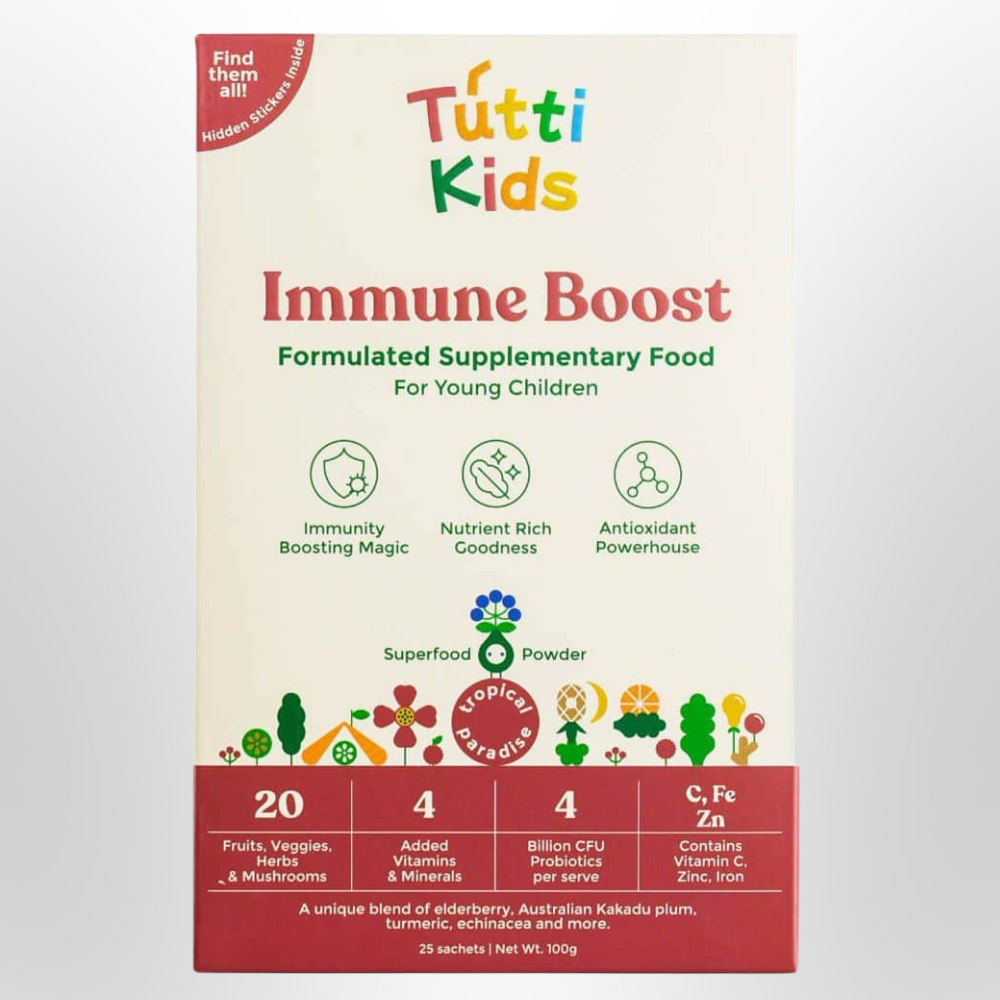 Tutti Kids Immune Boost is proudly Australian-made and specifically formulated to fill nutritional gaps, support a healthy gut microbiome, and help strengthen your child’s immunity in a single, simple scoop.